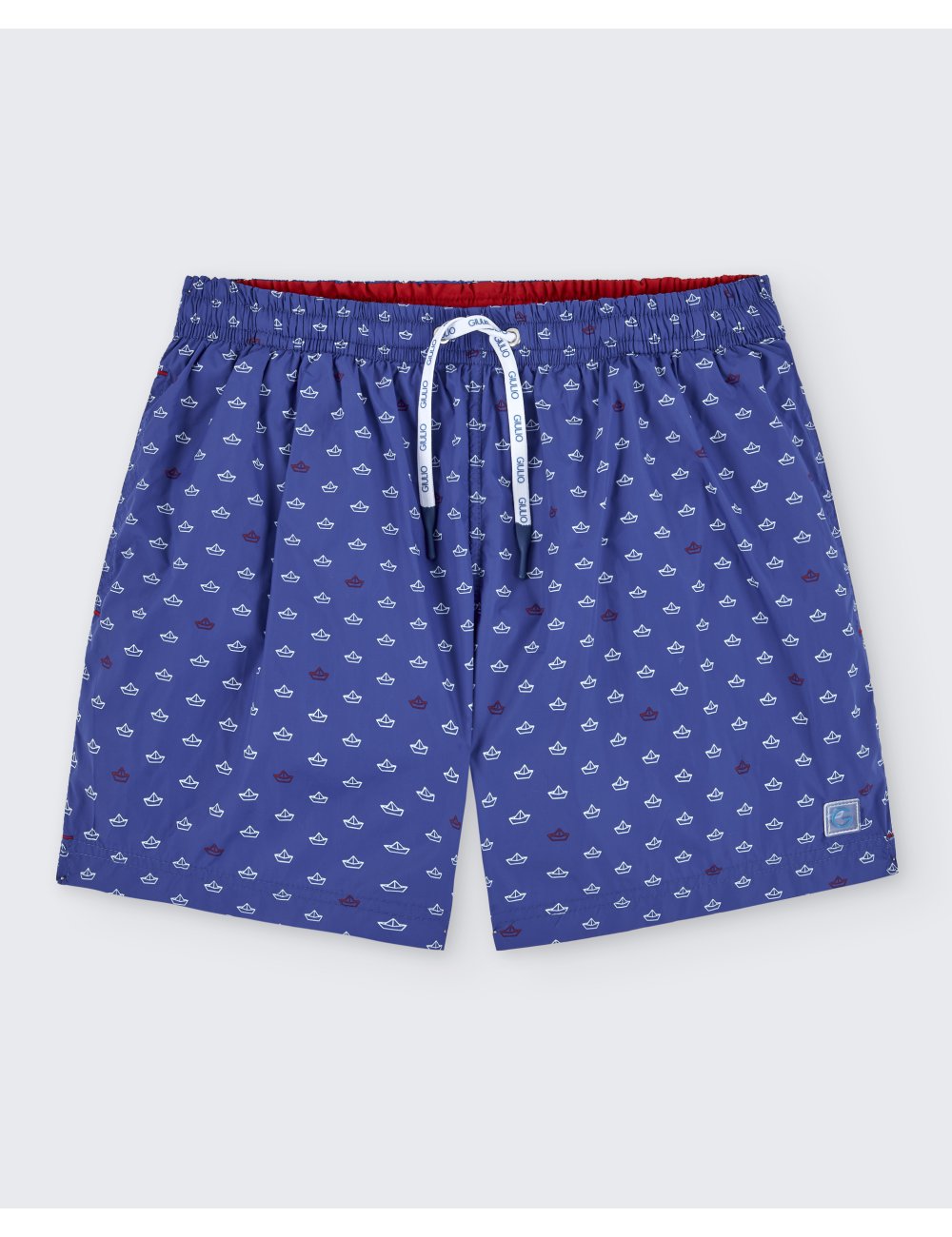 Bañador estampado con pequeños barquitos de papel en blanco sobre fondo azul. Tiene forro con pequeño bolsillo en el interior, bolsillos laterales y cordón de ajuste en la cintura elástica