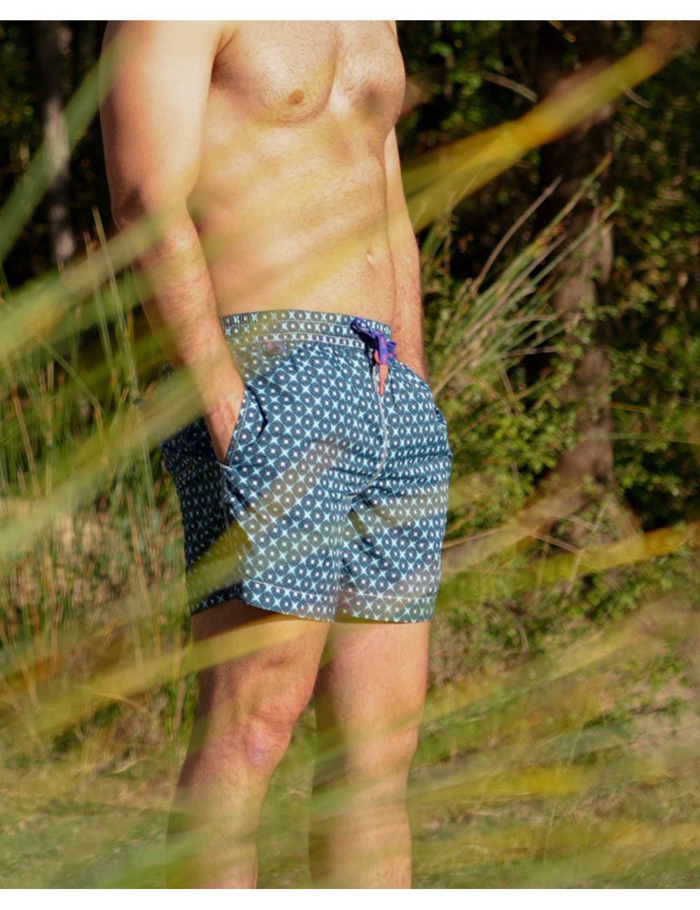 Bañador de hombre con estampado geométrico sobre fondo azul marino. Tiene forro con pequeño bolsillo en el interior, bolsillos laterales y cordón de ajuste en la cintura elástica.