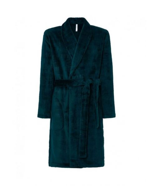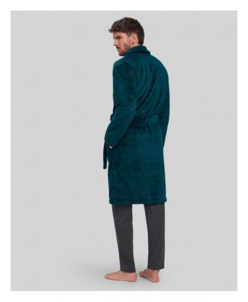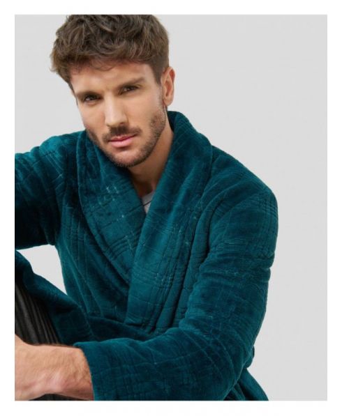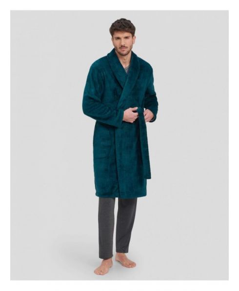 Bata larga de hombre, tejido liso, cruzada con bolsillos laterales.