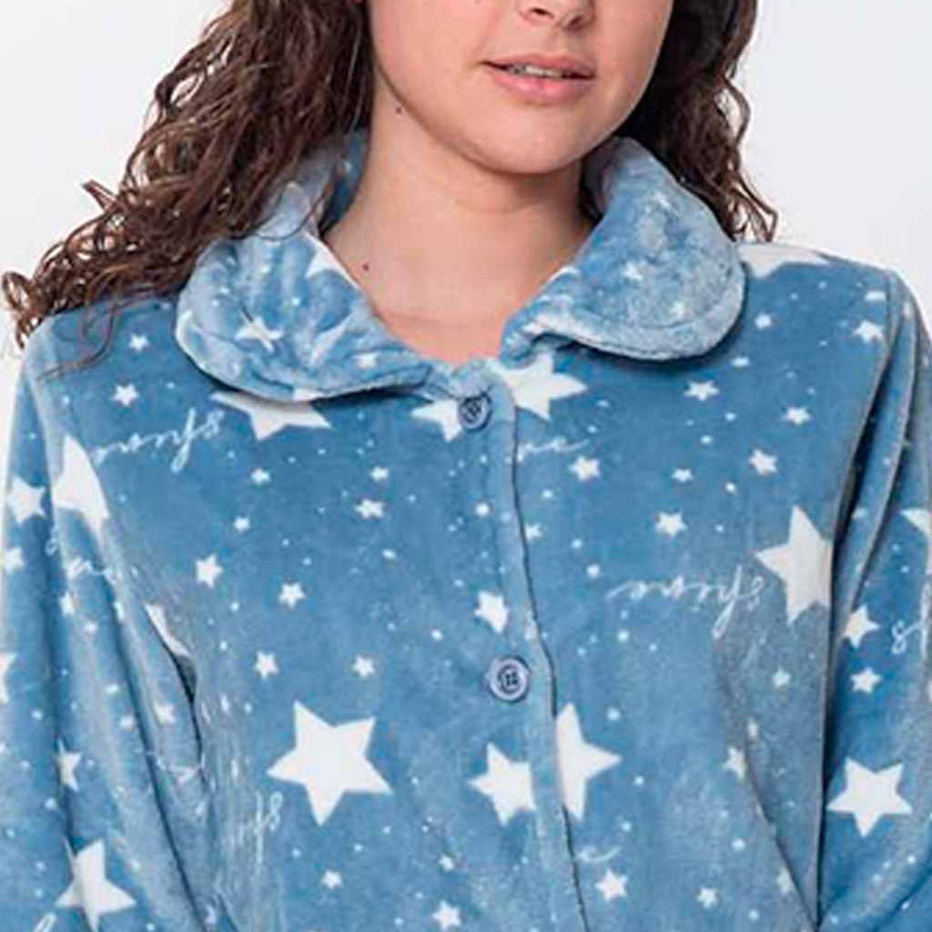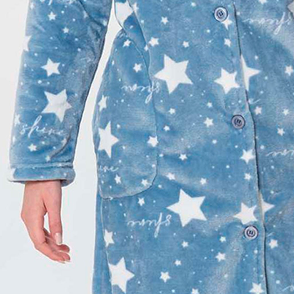 Bata de mujer larga con cierre de botones y bolsillos laterales confeccionada en coralina estampada de estrellas.