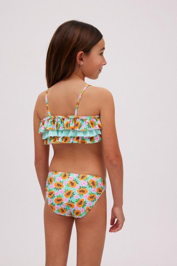 Conjunto de bikini infantil para niña con top de volantes y braga de estampado tropical.
