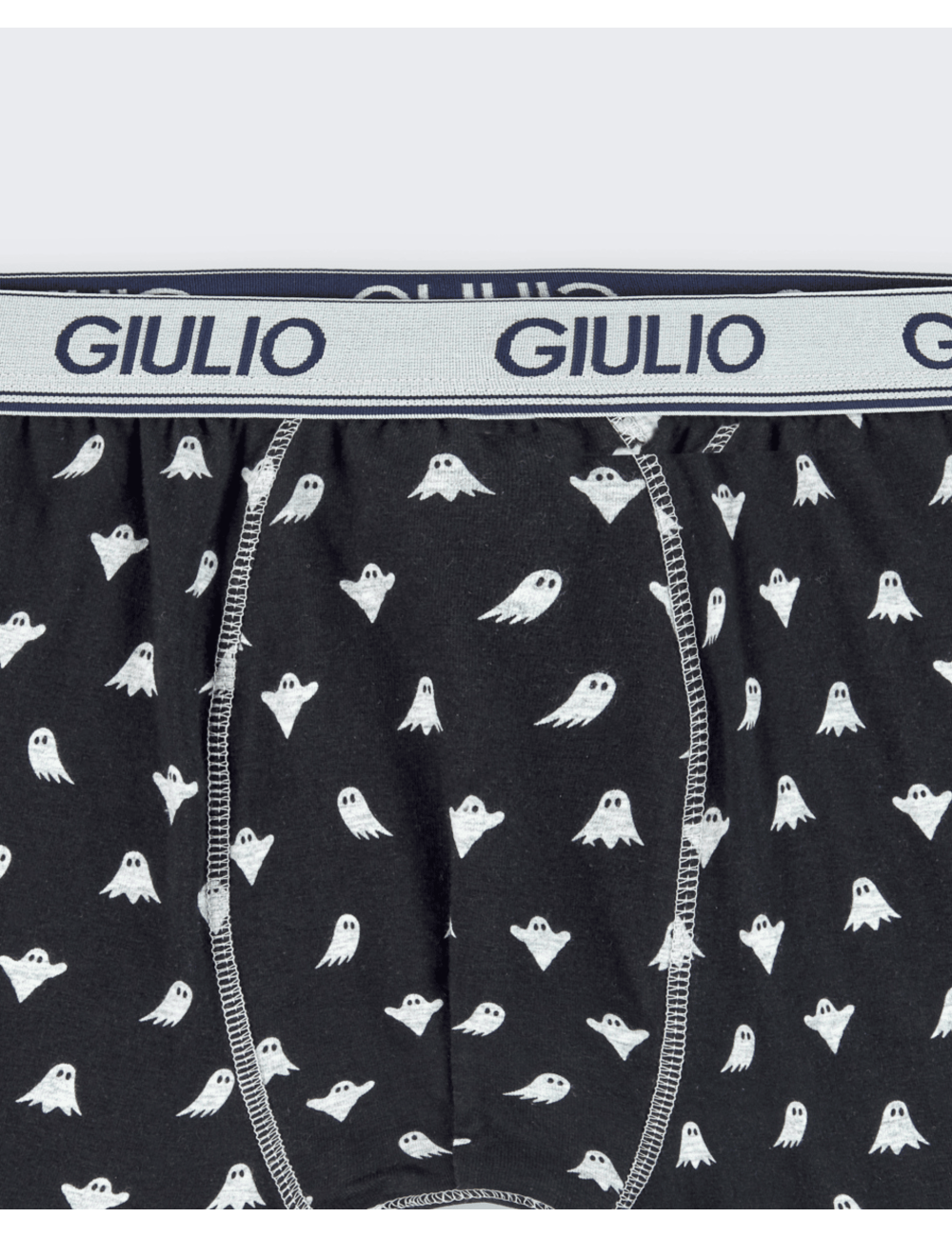 Bóxer estampado con pequeños dibujos de fantasmas sobre fondo negro. Tiene cinturilla de goma en color gris claro con el nombre de la marca en azul marino, y los ribetes a conjunto. NO cuenta con bolsillo delantero.