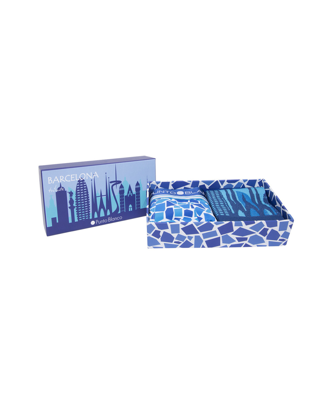 Caja que contiene un bóxer de microfibra estampada y unos calcetines de algodón inspirados en la ciudad de Barcelona. Bóxer con cintura con goma y logotipo de la marca. Calcetines talla única. Serie limitada y coleccionable.