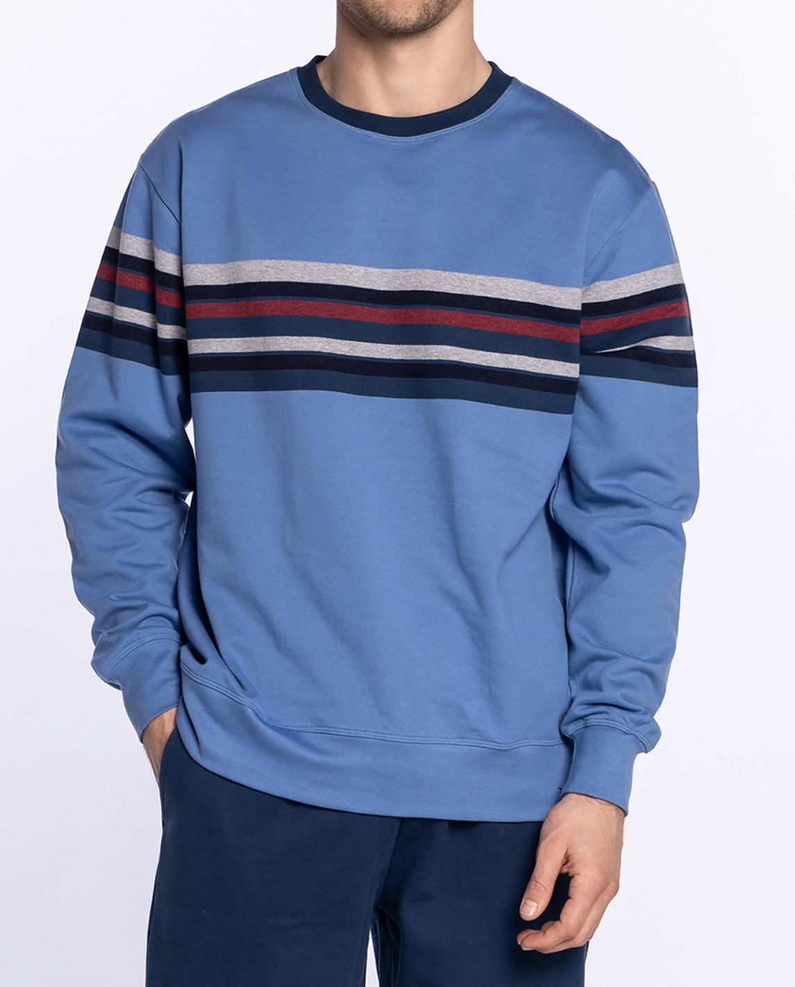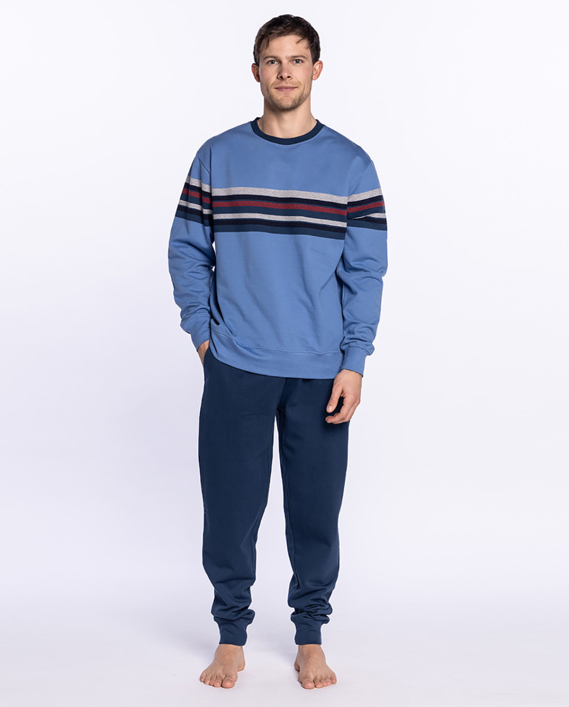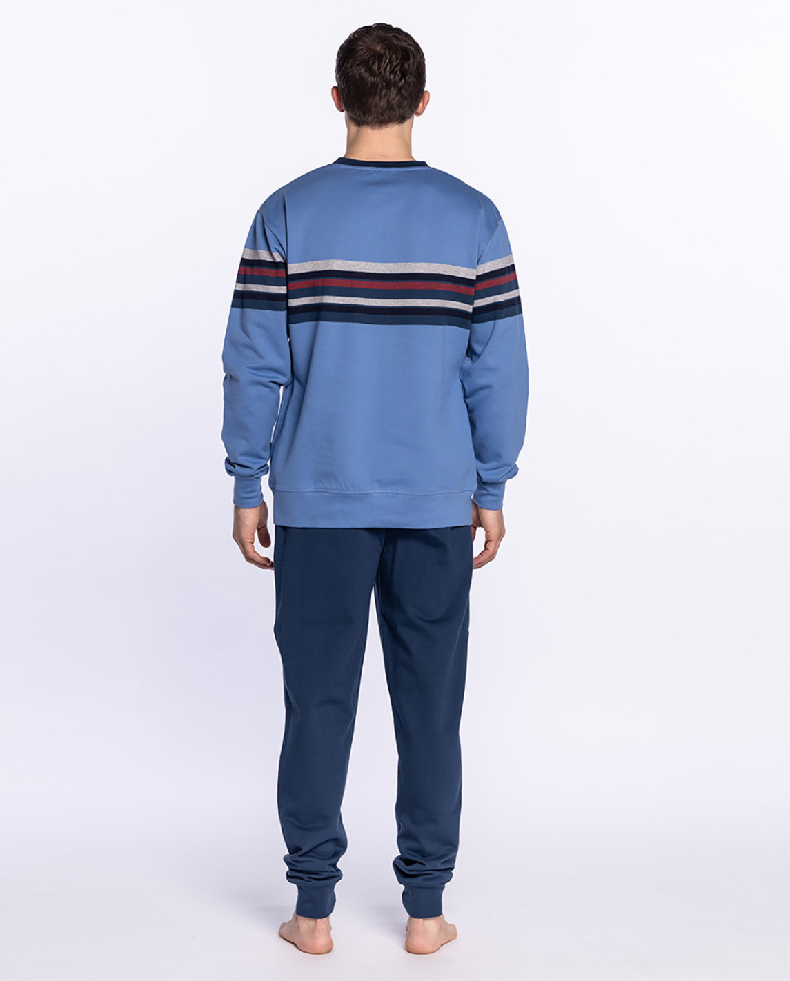 Pijama largo de felpa perchada 100% algodón. Camiseta de rayas posicionadas, cuello redondo y manga larga con puño, combinada con pantalón largo con puño, bolsillos laterales y cintura ajustable con cordón. Tejido muy suave y agradable.
