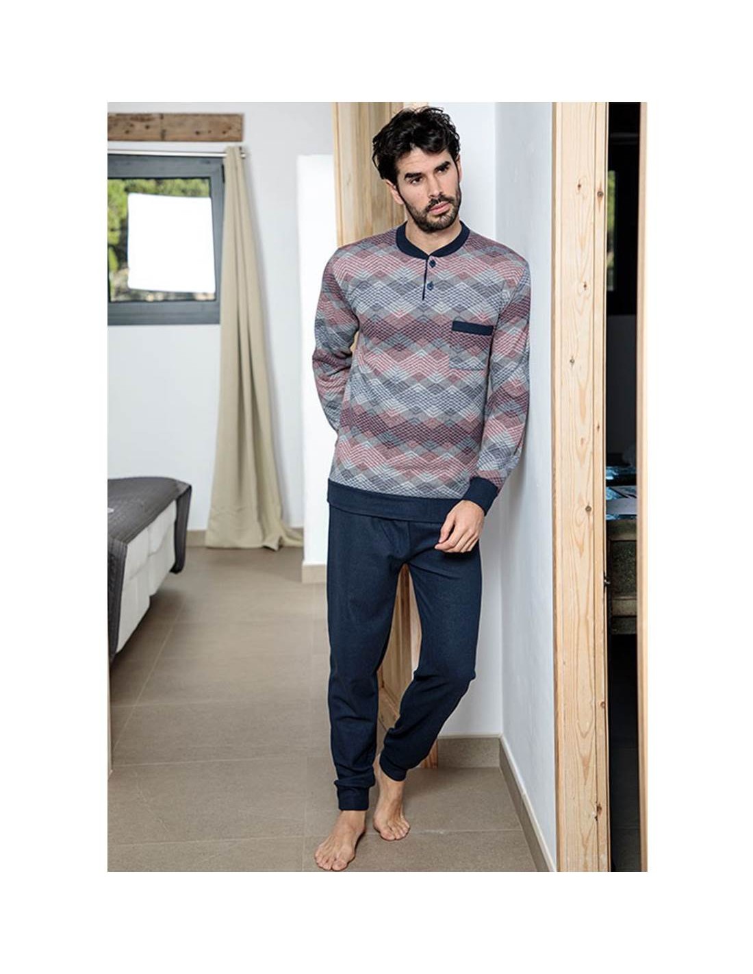 Pijama Largo Algodón de la marca Muslher. Camiseta de manga larga y cuello redondo abierto con tapeta y botones, confeccionada en tejido de punto milano, con un diseño geométrico en varios colores. Pantalón largo confeccionado en el mismo tejido, con un diseño en color azul marino.