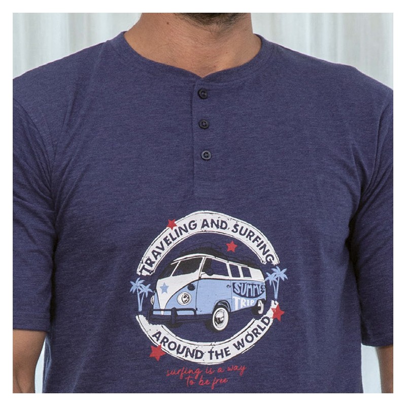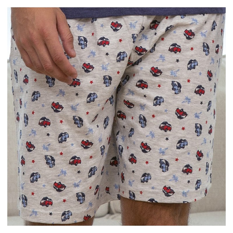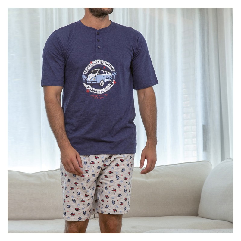 Pijama hombre Muslher MU245023 Punto liso Este pijama de verano para hombre es perfecto para las noches cálidas y relajantes. El conjunto consta de una camiseta de manga corta con un cuello redondo clásico y botones en la parte delantera. La característica destacada de la camiseta es un dibujo estampado en el centro, que le da un toque de estilo y personalidad. La camiseta en sí es de un elegante color azul marino, que es versátil y atemporal. El color azul marino es una opción clásica que se adapta a cualquier estilo y ocasión. El pantalón corto que acompaña a la camiseta está estampado, combinando con el estampado central de la camiseta. Esto crea una armonía visual y un aspecto moderno y atractivo. Este pijama de hombre ofrece estilo, comodidad y frescura durante las noches cálidas. ¡Disfruta de noches de verano relajantes con este pijama de alta calidad! Presentación: Caja de la marca Color: Único Tallas: S, M, L, XL y XXL Composición: 98% Algodón y 2% poliéster
