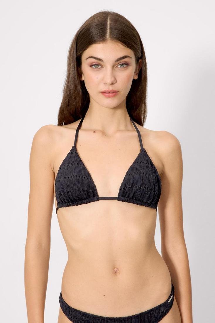 Top bikini triángulo sin aro y con relleno extraíble. Anudado al cuello y la espalda. Tejido con textura calada. Combínalo con una braga de bikini a conjunto para un look completo